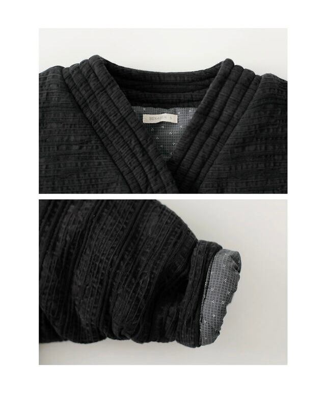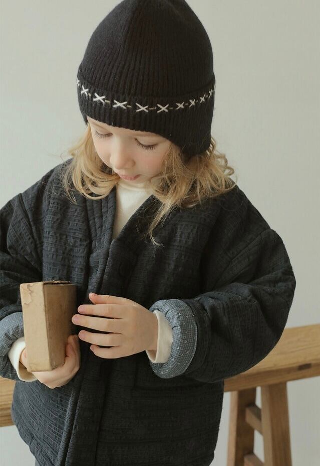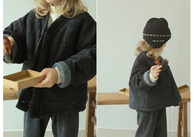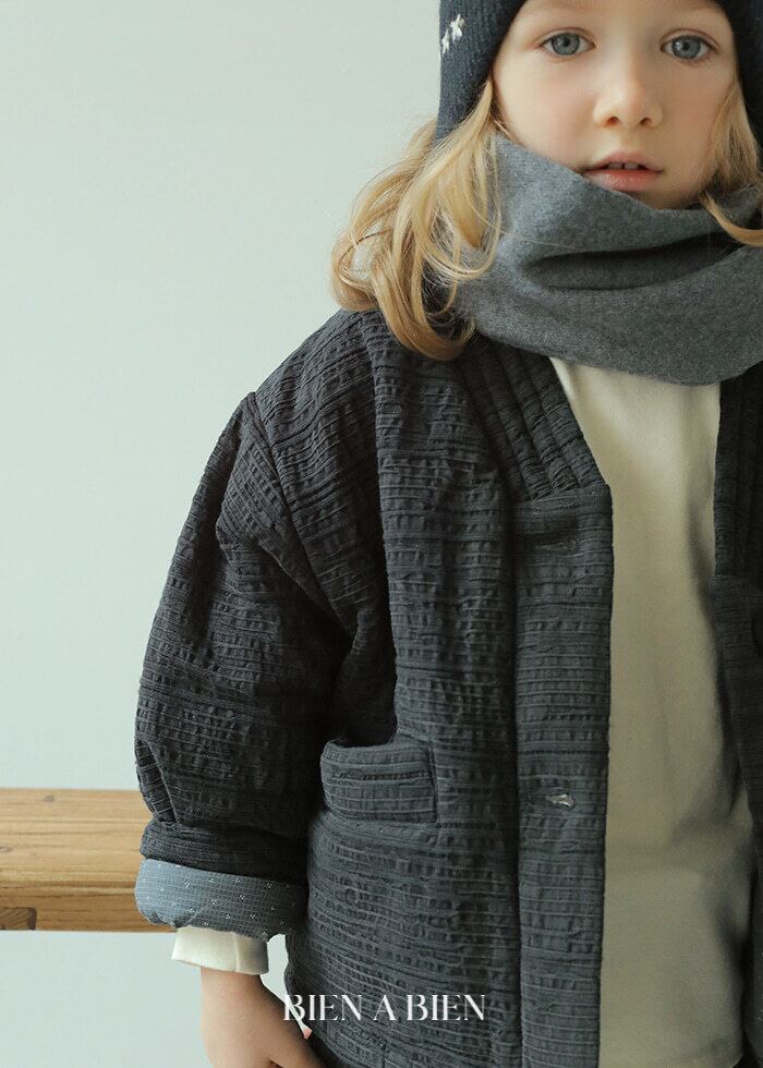 「BN デセール ジャカードジャケット」。ストライプ組織で、自然に細かいシワが入った生地を使用した高級感あるジャケットで、ヴィンテージ風のウォッシュ加工によりナチュラルな魅力もプラス。表地・裏地それぞれに軽く暖かいハス綿をボンディングしており、ふんわりと柔らかいタッチ感で、秋から冬にかけての寒い日にもぴったりです。きれいに落ちるVネックラインにはステッチを加え、少し見える裏地にはさりげなく可愛い生地をあしらったポイントも。BNならではの洗練された感性が詰まったジャケットで、男の子・女の子どちらにもおすすめの一着です。