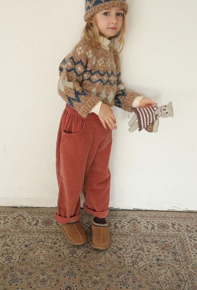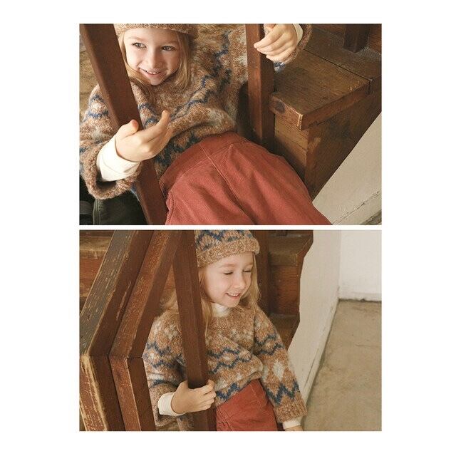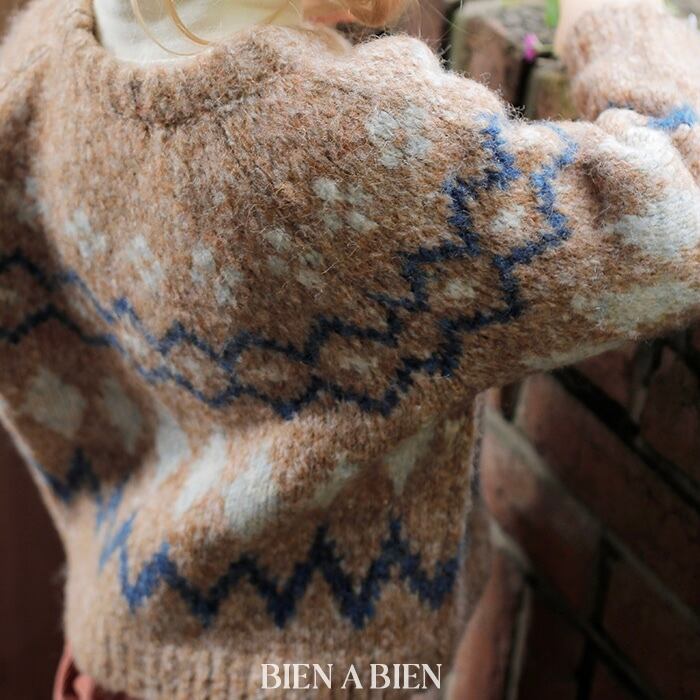 ビエナビエンらしいあたたかくユニークな感性が詰まった一枚。配色でアクセントをつけたノルディック調のパターンが、かわいらしさと上品さを兼ね備えたBIENABIENの冬ムードを表現しています。しっかりとした厚みと、型崩れしにくい密度のある編み地で、やわらかな肌触りと快適な着心地を実現。ネックライン・袖口・裾のリブ仕様が全体をすっきりまとめてくれます。モックネックTシャツやシャツなどをインナーに重ねて、あたたかくスタイリッシュな冬のレイヤードをお楽しみください。