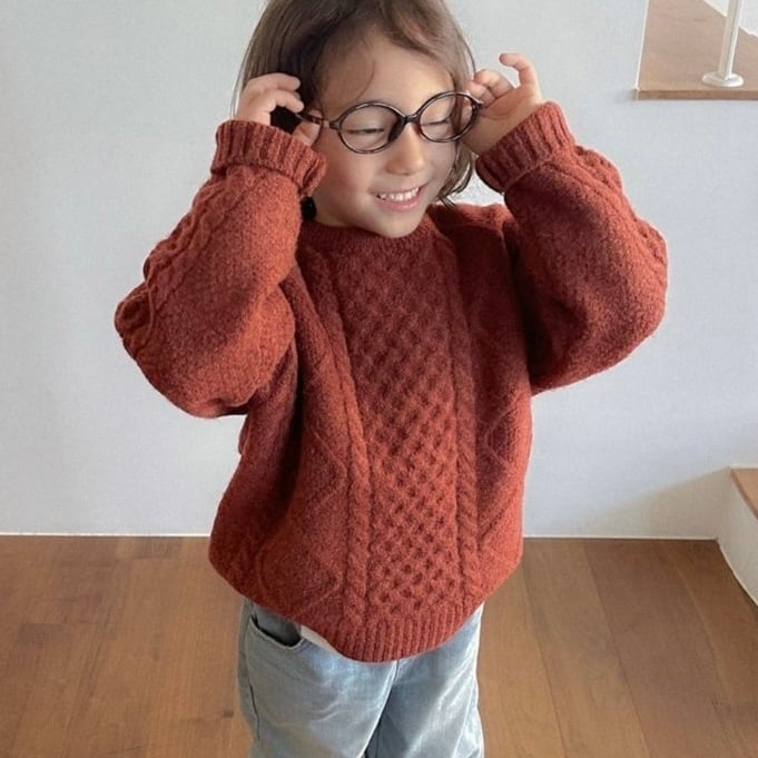 ニットといえば欠かせない“ツイスト(ケーブル)編み”。ほどよく控えめな編み柄が上品で、あたたかみのある雰囲気を演出します。子どもにとって大切なのは、やっぱり“着心地の良さ”。このニットは全体的にゆったりとしたシルエットで、中にTシャツやタートルネックを重ねても窮屈にならず、動き回るお子さまも快適に過ごせます。シンプルなボトムスを合わせるだけで、お出かけ気分を感じさせる上品なコーデが完成。ナチュラルさと洗練さを兼ね備えた、秋冬シーズンにぴったりのおすすめニットです。