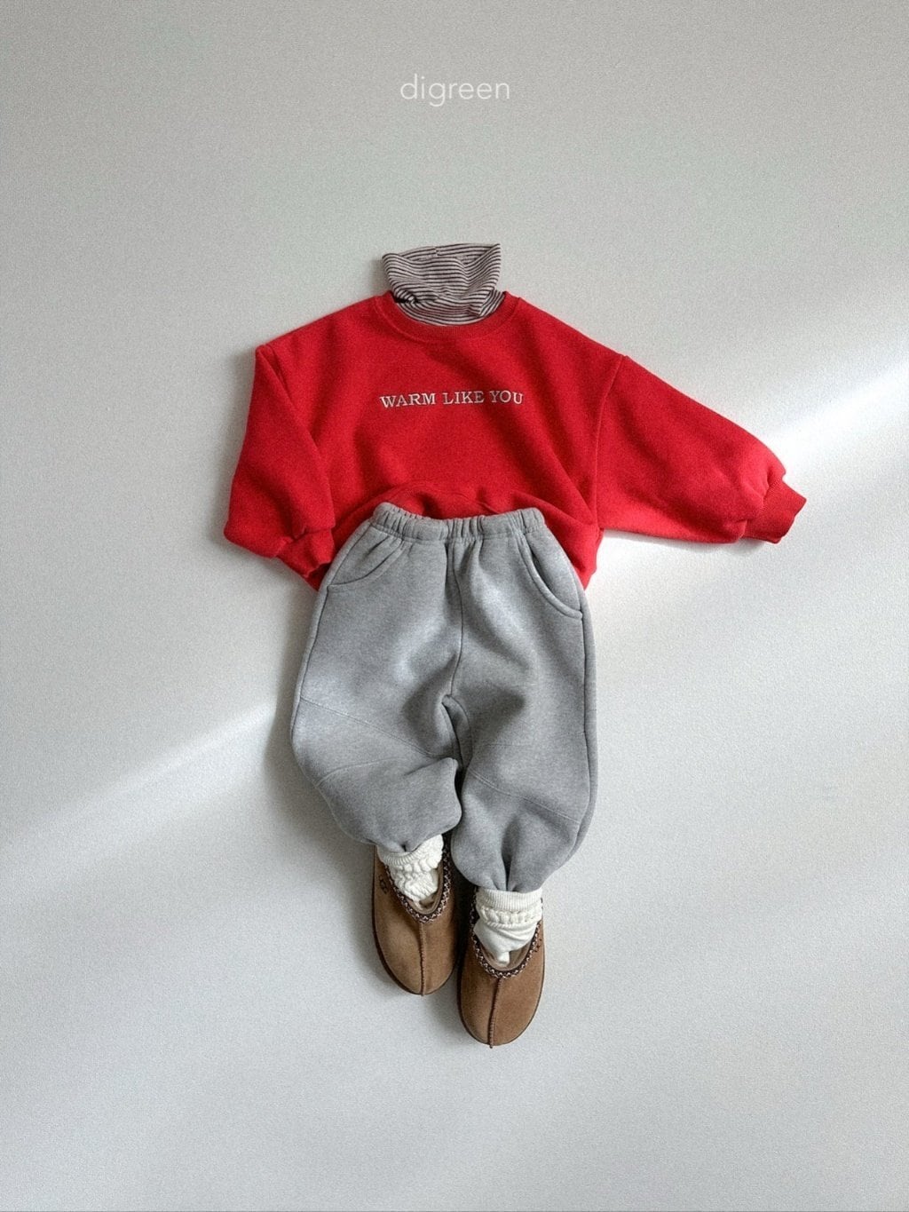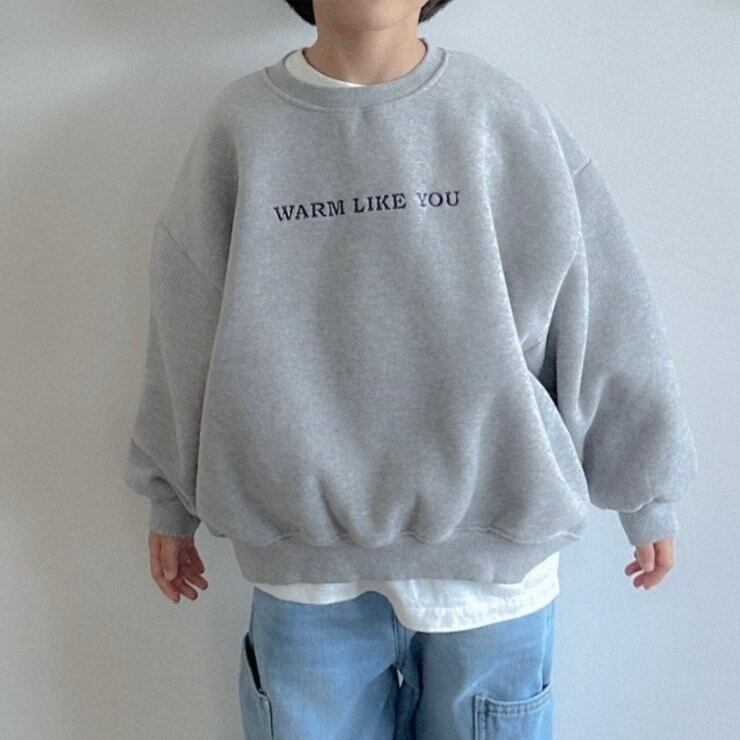 フロントの「WARM LIKE YOU」刺繍がさりげないポイントになり、シンプルながらも感性のある雰囲気に。落ち着いたトーンのカラーなので、どんなボトムスにも自然にマッチします。デニム、ジョガー、レギンスなど、合わせるだけでバランスよく◎寒い日にはしっかり暖かく、室内ではリラックスして。お子さまが毎日着たくなる、そんなスウェットです。