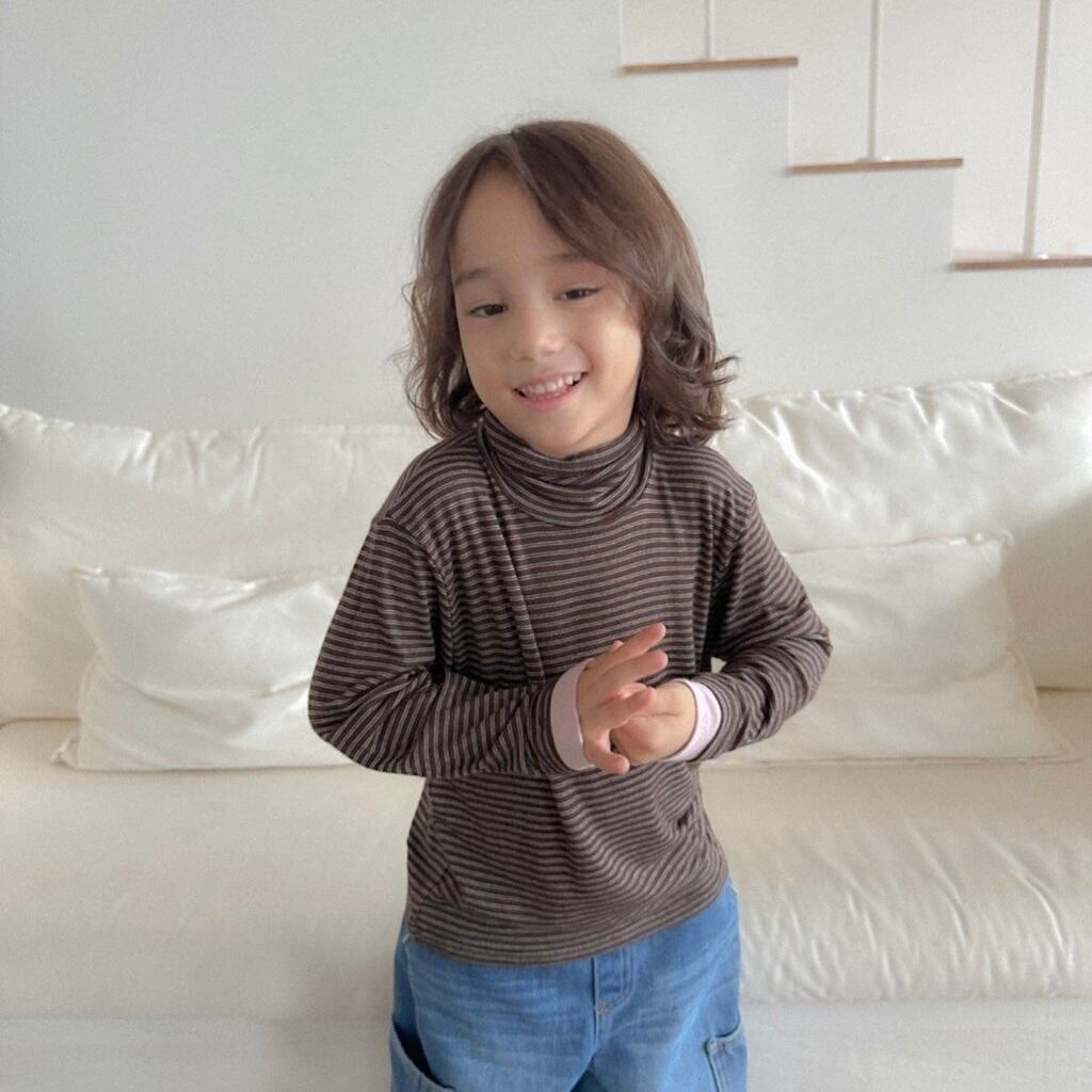柔らかくて伸びのある素材のレイヤードタートルを紹介します。レーヨン96%、スパン4%の混紡で、肌に触れたときの感触がとてもなめらか。ほどよい伸縮性があり、お子さまの動きにも優しくフィットします。一日中着ていてもストレスのない着心地です。袖口とボディにさりげなく入ったストライプがポイントになり、控えめながらも洗練された印象を演出します。