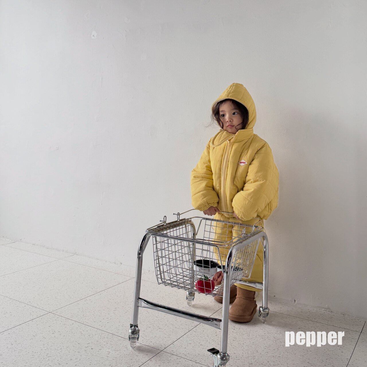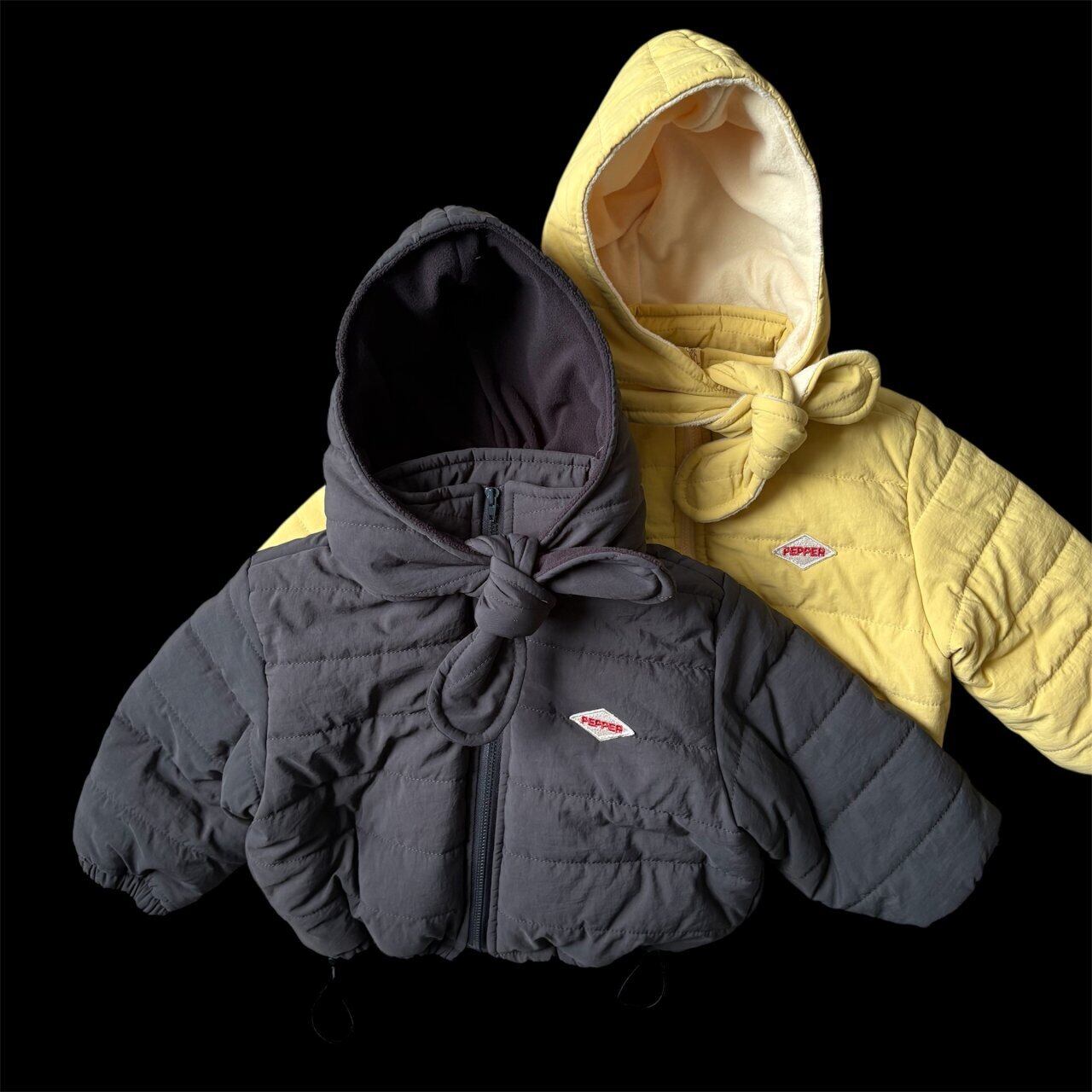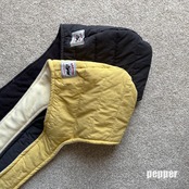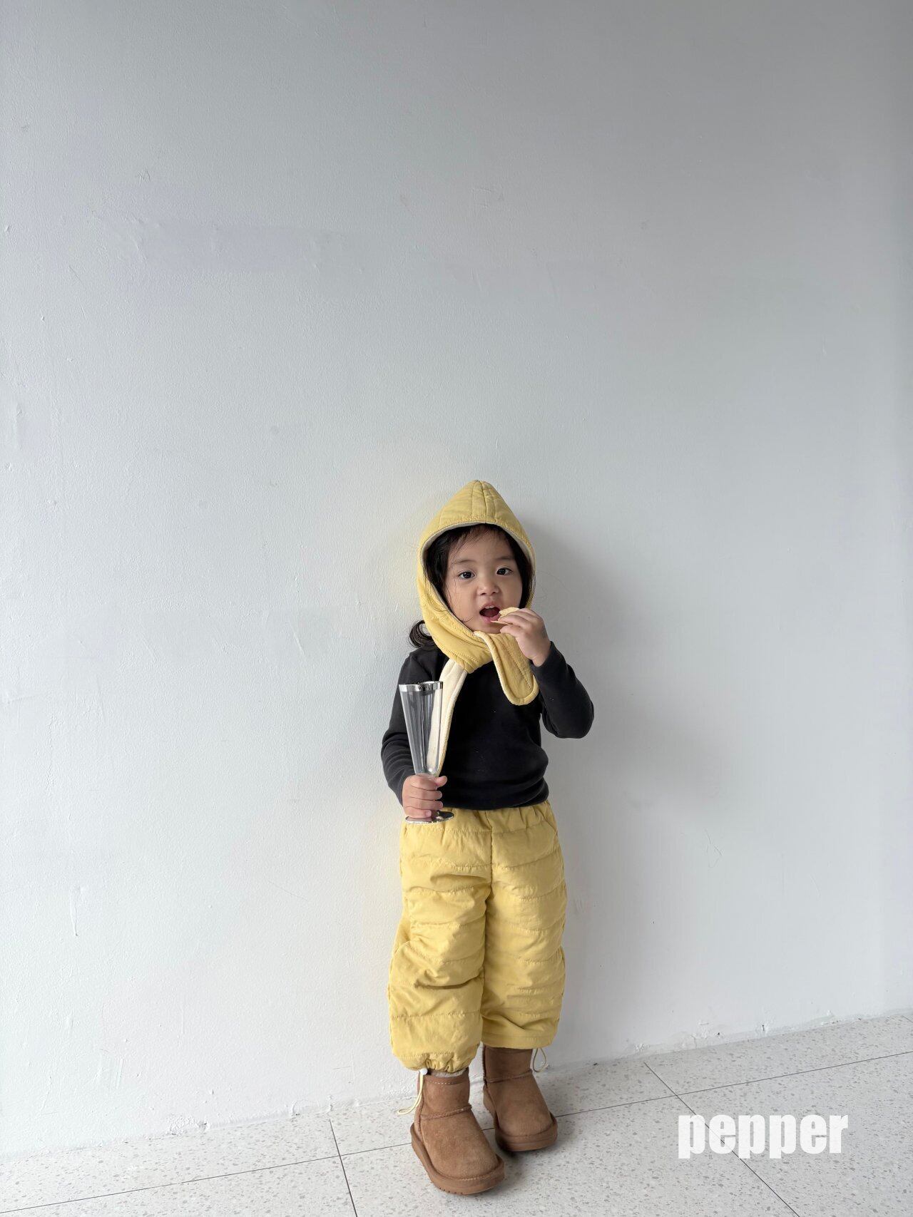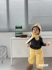 パディングマフラーハットは、裏地に柔らかいポリエステル素材を使用しており、肌に触れても心地よい感触です。PEPPERのポイントラベルでかわいらしさをプラス。バナナパディングやパディングパンツと合わせても可愛く、単独で他の服とコーディネートしても活躍するアイテムです。