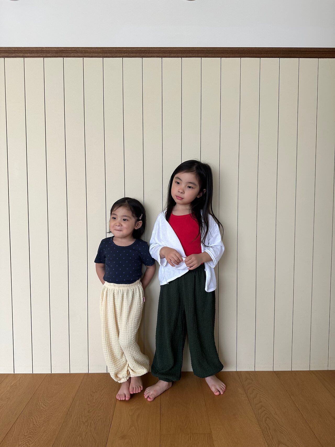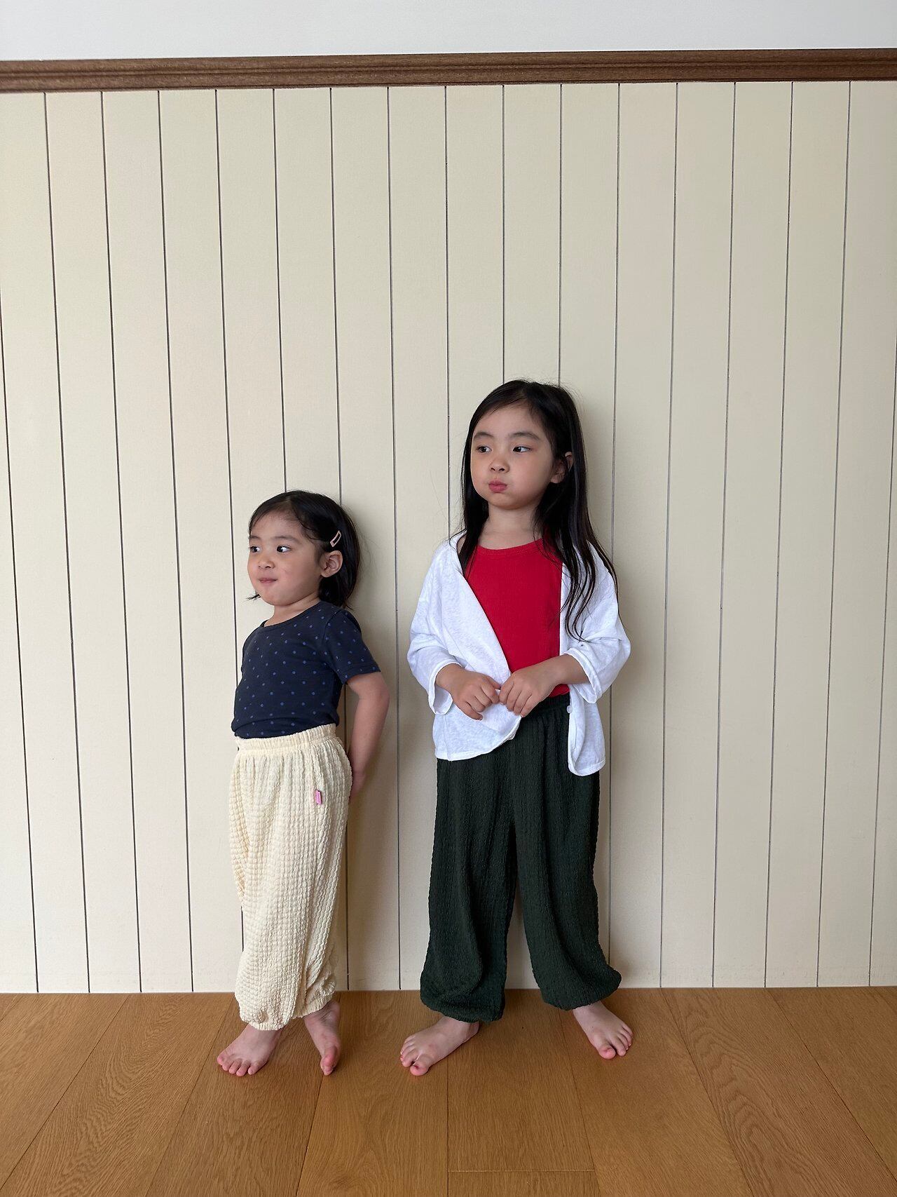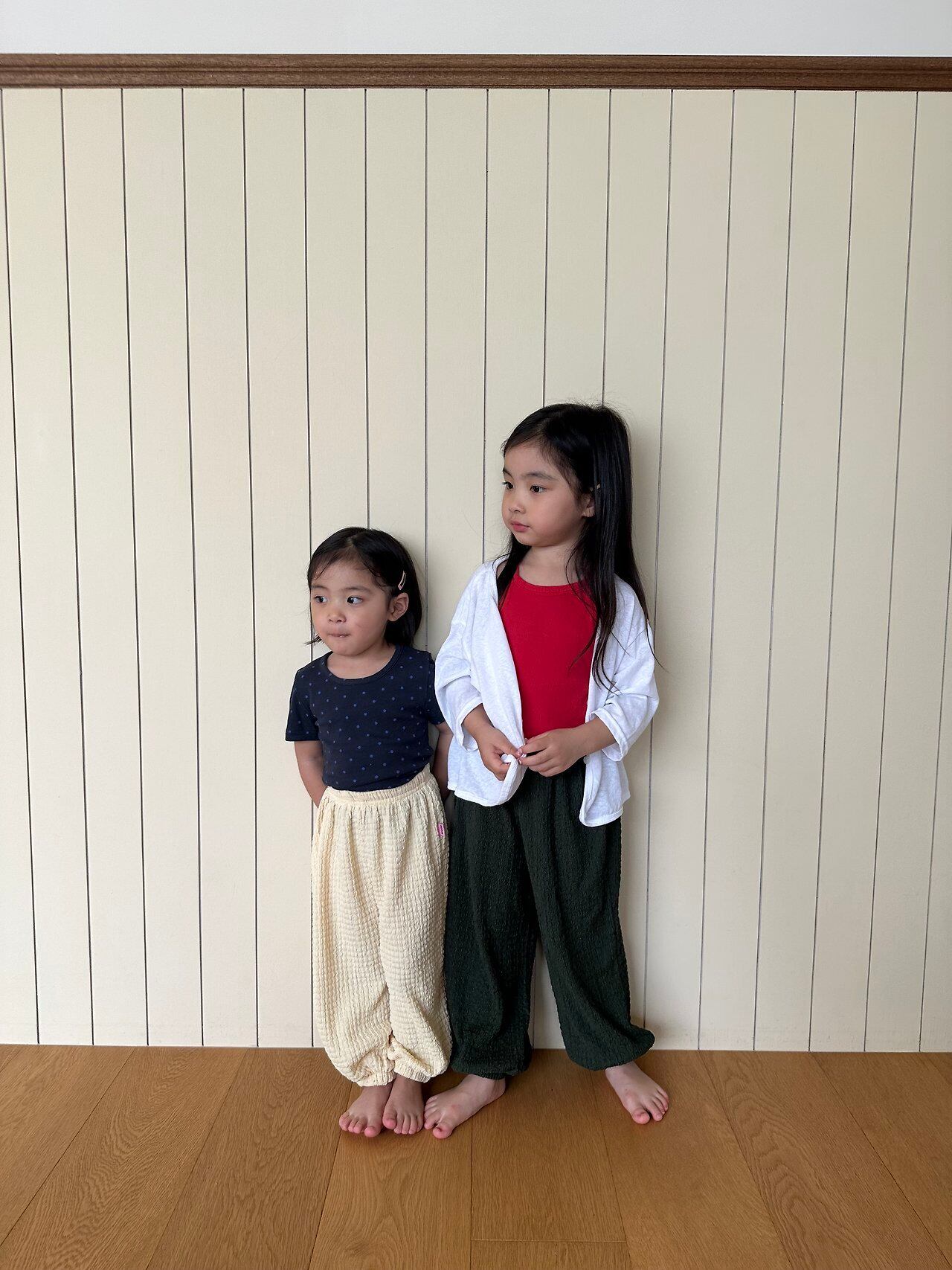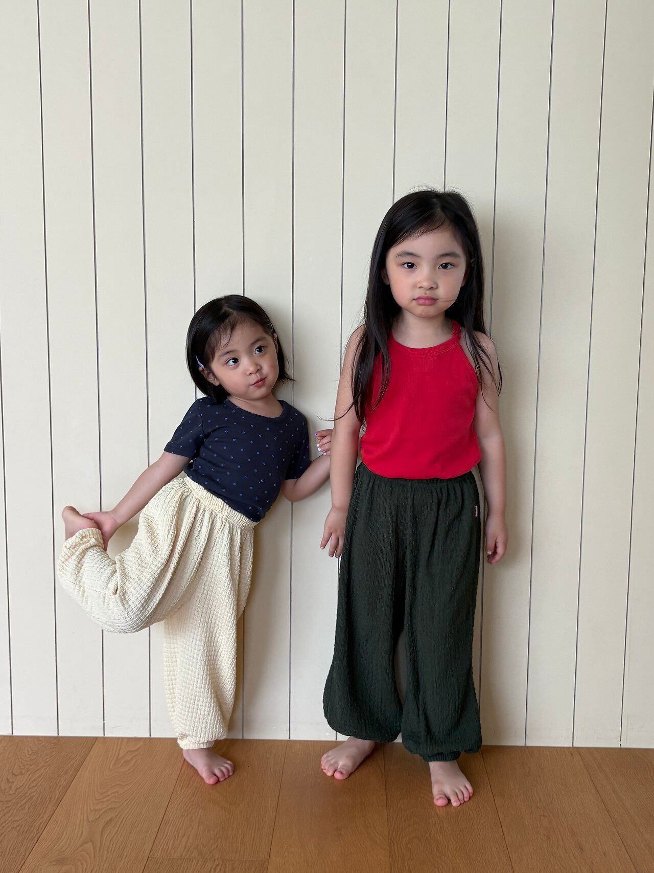柔らかくて涼しい素材の、夏用ジョガーパンツです!昨年大人気だった“コットンキャンディーパンツ”と同じ素材を使用し、今回はカラーを変えて登場しました♡3色の中でも、個人的イチオシはダークグリーン!そこから名付けられた「ミヨク(わかめ)サマージョガー」ですㅎㅎ程よいストレッチ性もあり、たくさん動くお子さまにも快適に着ていただけます◎