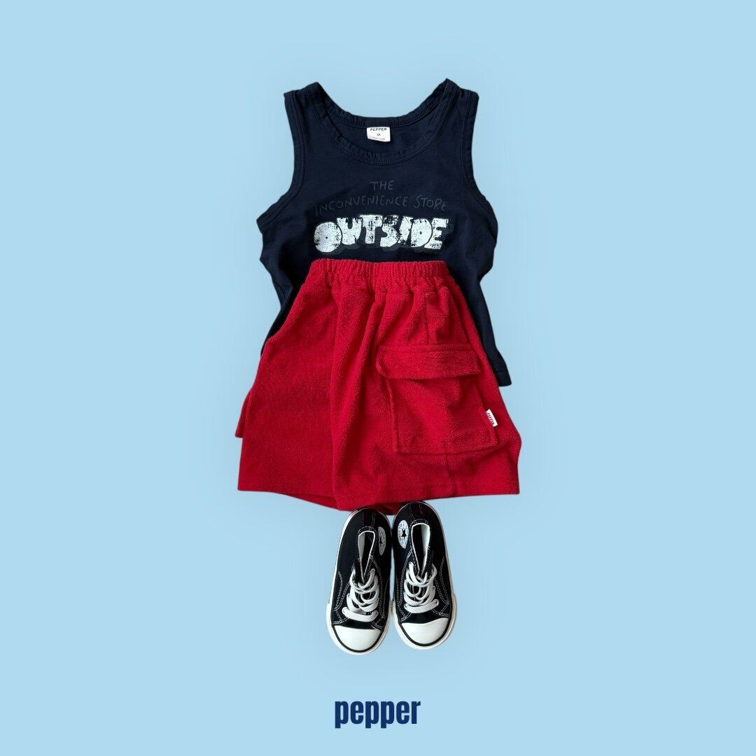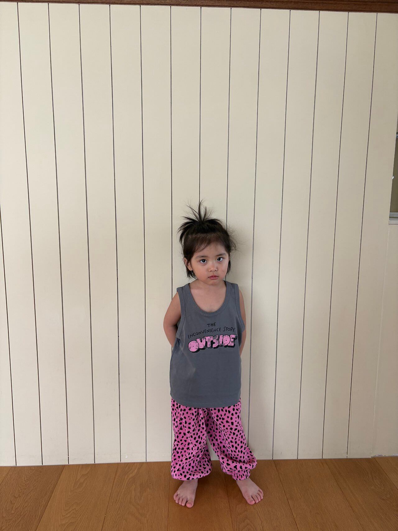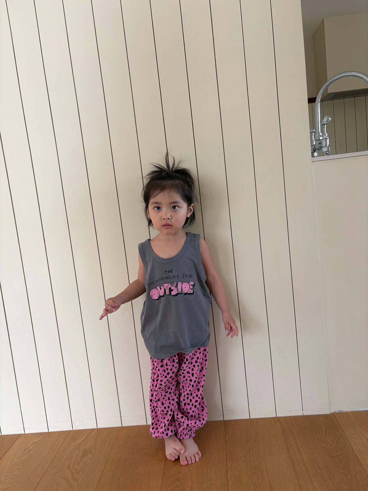 落ち着いたカラー感の生地に、ヴィンテージ風プリントがポイントのノースリーブトップです。特にグレー×ピンクの配色は、男の子・女の子問わずおすすめのカラー♡どんなボトムとも相性がよく、カジュアルに着回しやすい一枚です!