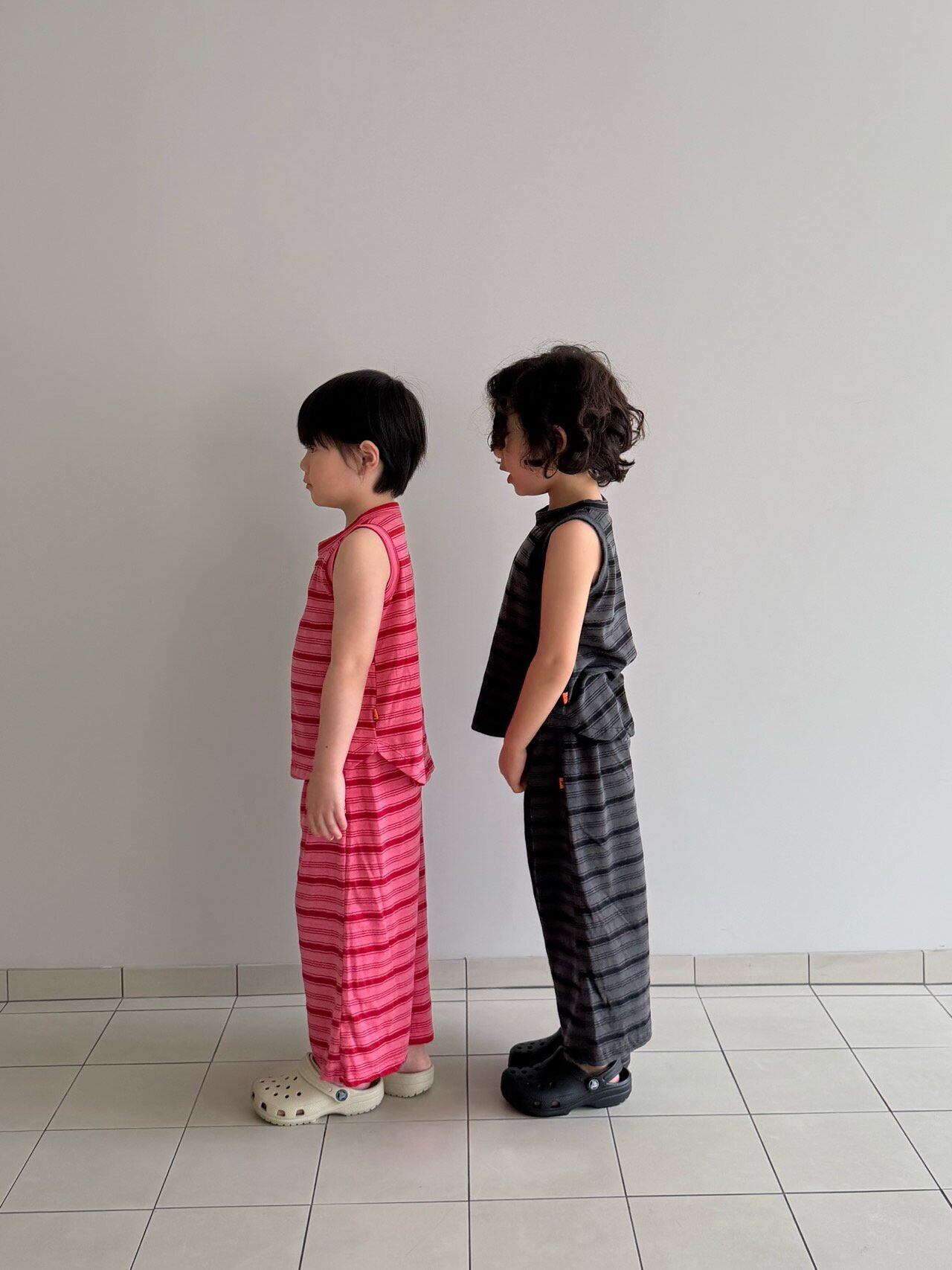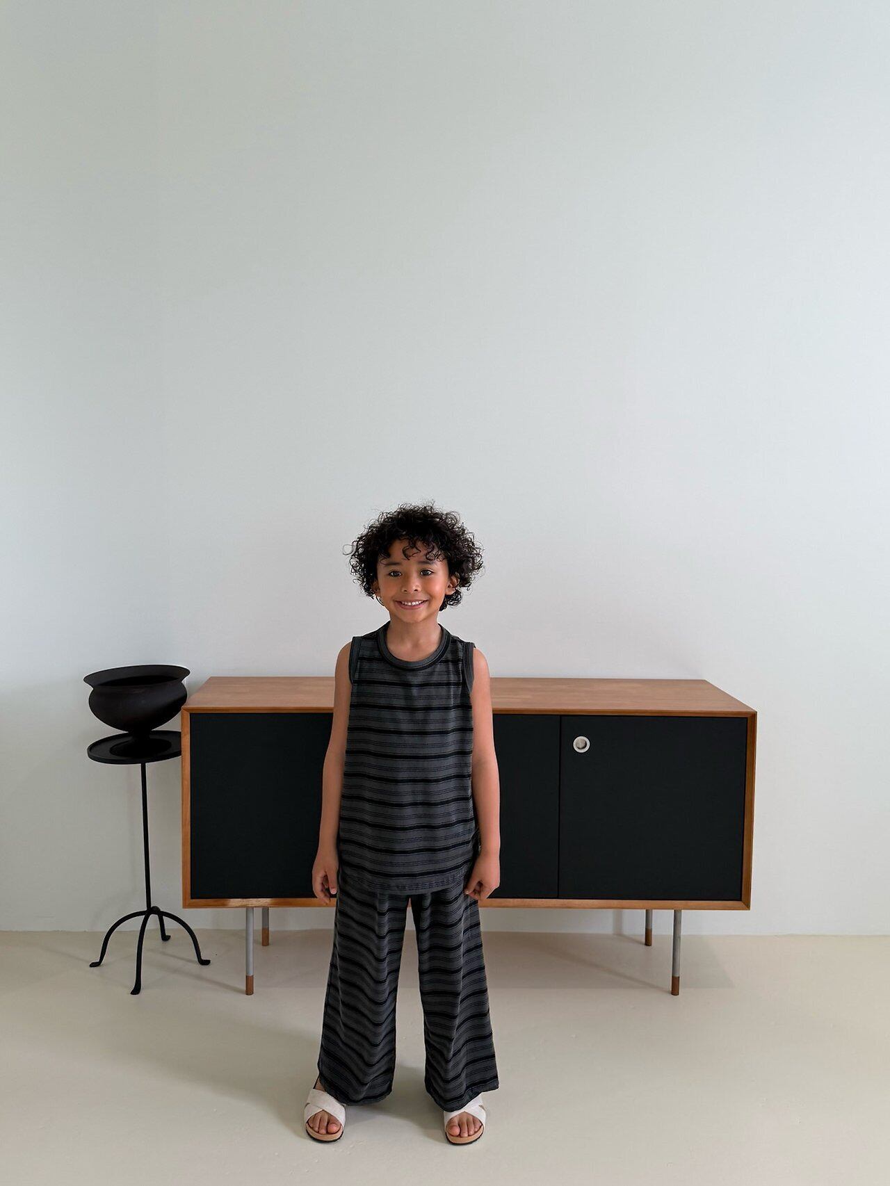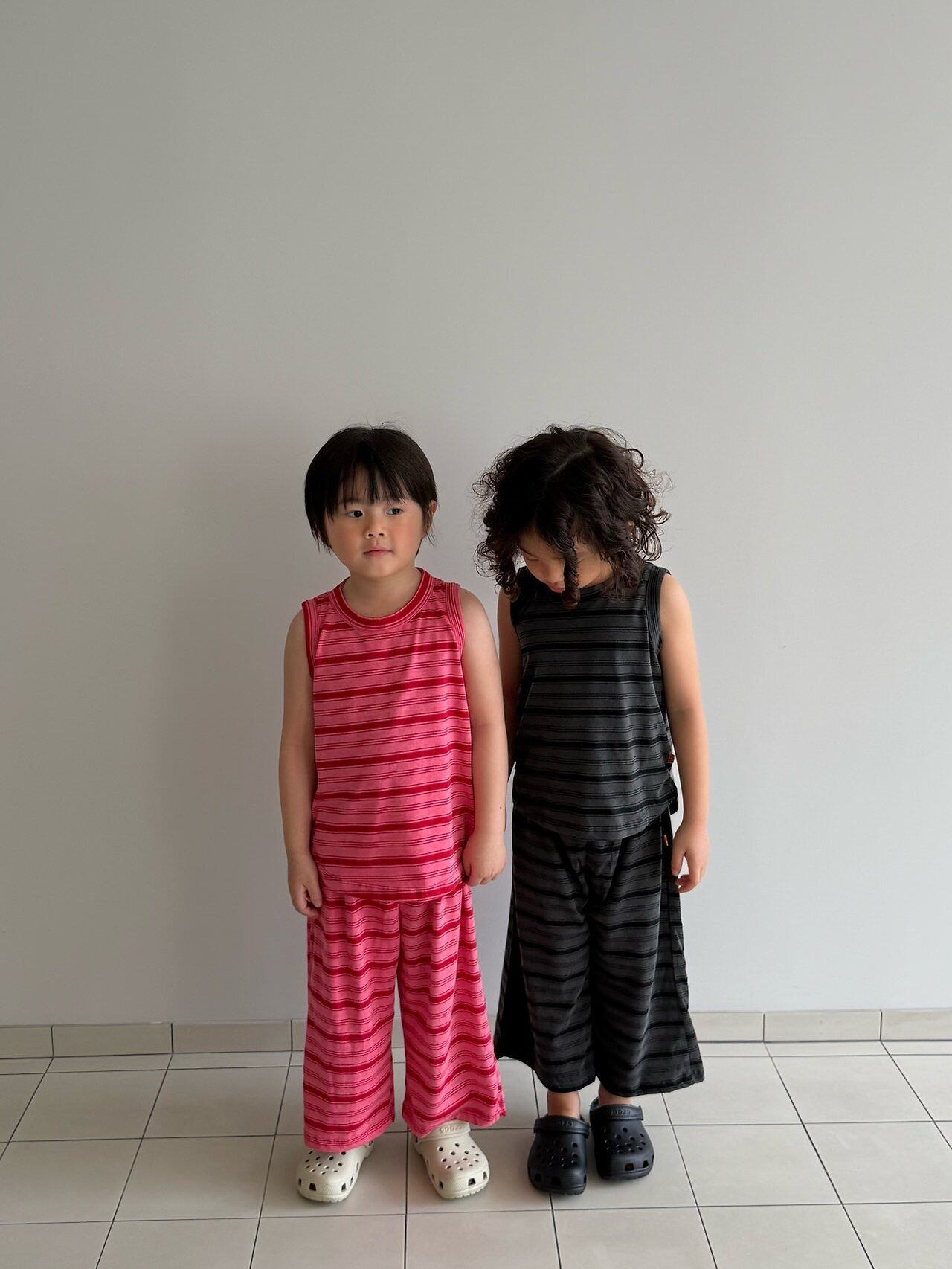 ひと目で惹かれる、ピグメント加工のレトロボーダーセットアップ!風合いのあるカラーと、ヴィンテージライクなムードがたまらない一着。さらっと軽い着心地で、通気性のいいタンクトップ×ワイドパンツの組み合わせは暑い夏もこれひとつでコーデが完成◎ラフなのにしっかりおしゃれ見えする、“ちゃんと可愛い”セットアップです。男女問わず着られるデザインで、おしゃれにこだわるママにぜひおすすめしたいアイテム!
