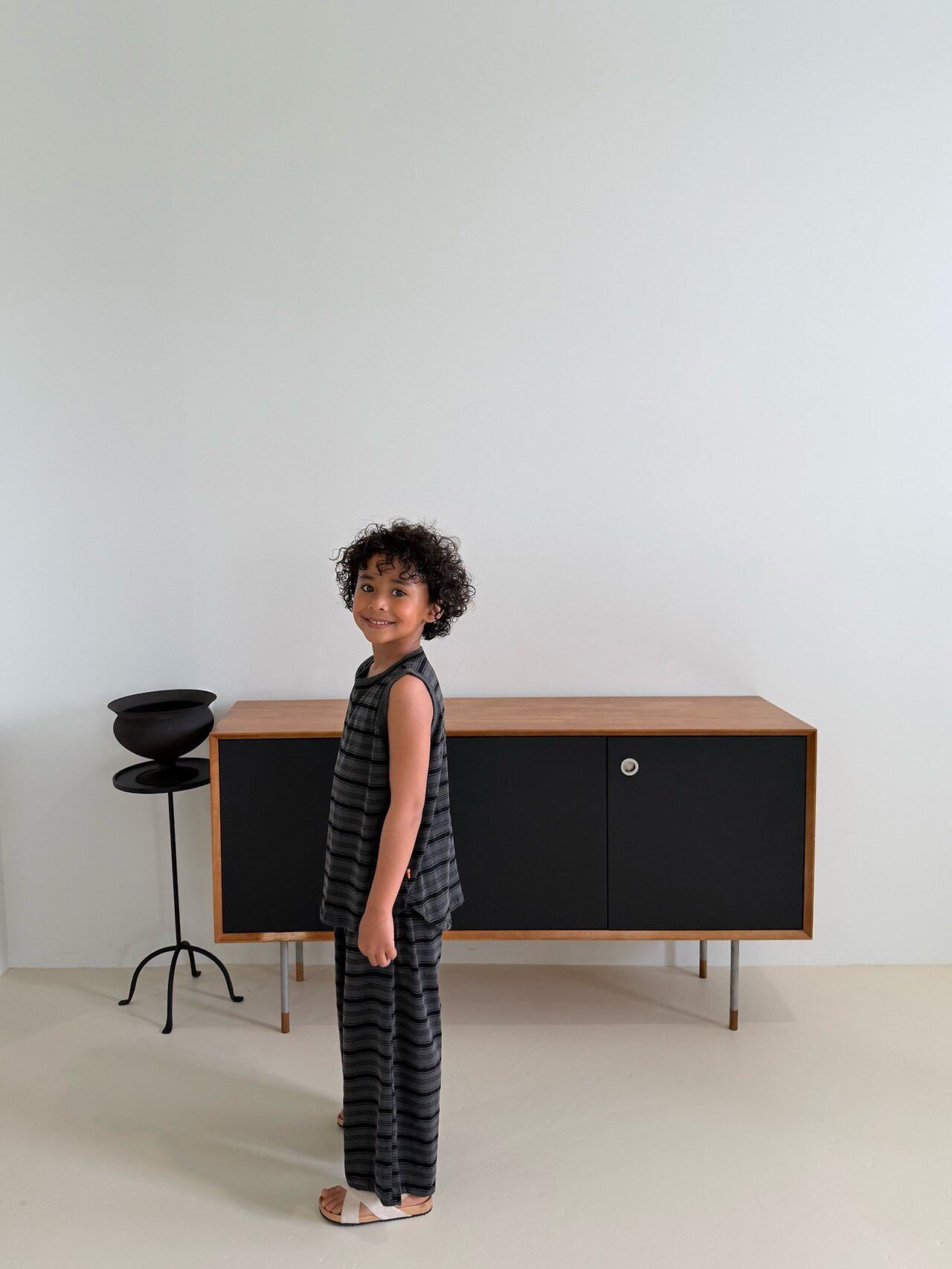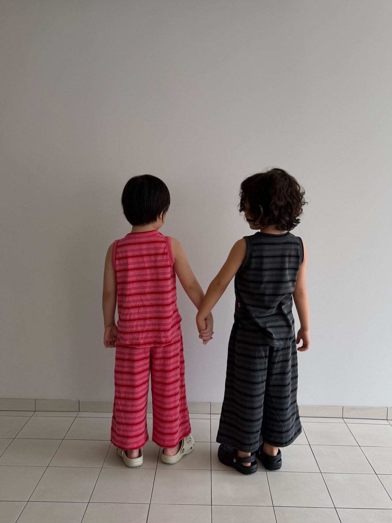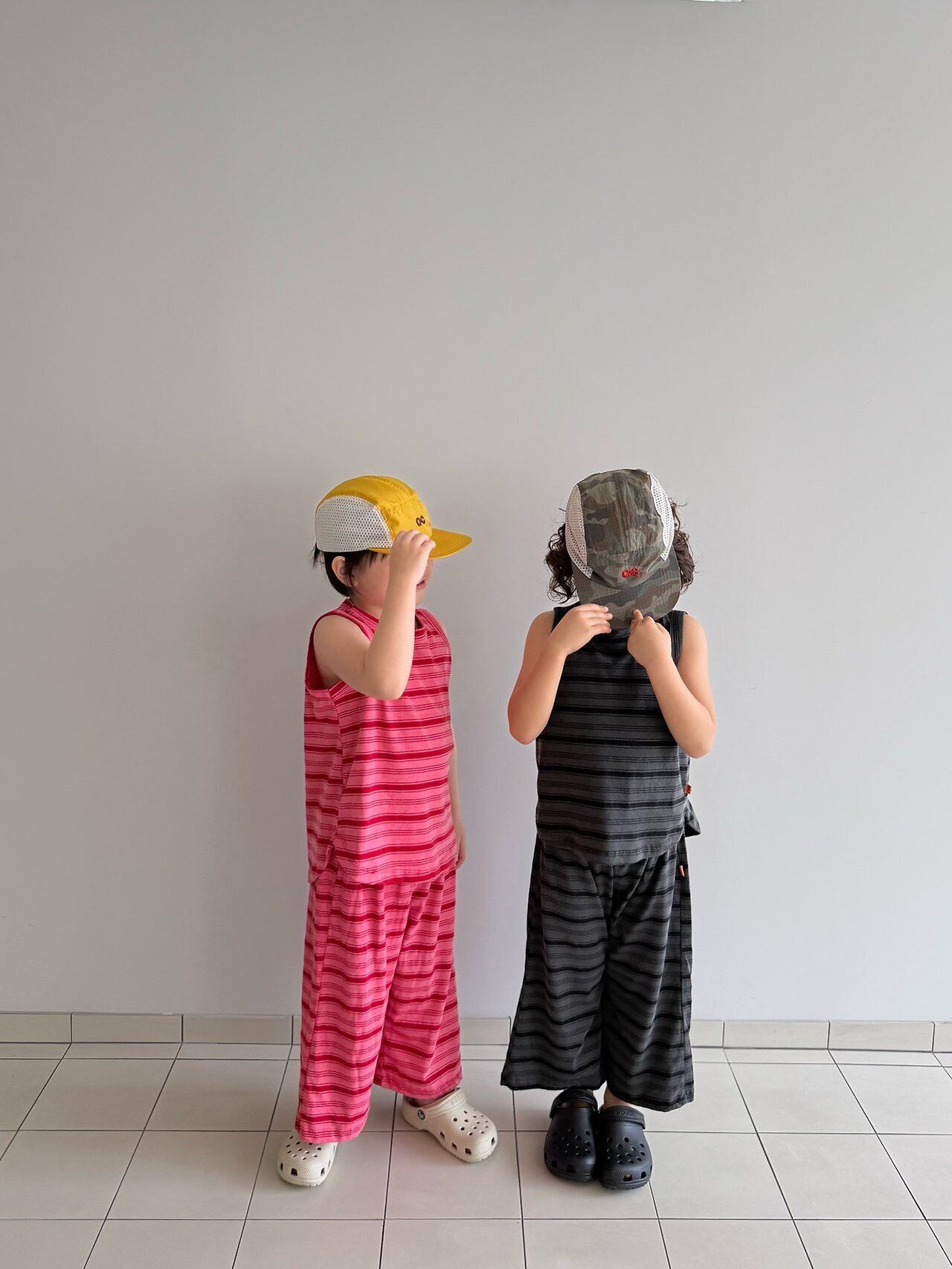 ひと目で惹かれる、ピグメント加工のレトロボーダーセットアップ!風合いのあるカラーと、ヴィンテージライクなムードがたまらない一着。さらっと軽い着心地で、通気性のいいタンクトップ×ワイドパンツの組み合わせは暑い夏もこれひとつでコーデが完成◎ラフなのにしっかりおしゃれ見えする、“ちゃんと可愛い”セットアップです。男女問わず着られるデザインで、おしゃれにこだわるママにぜひおすすめしたいアイテム!