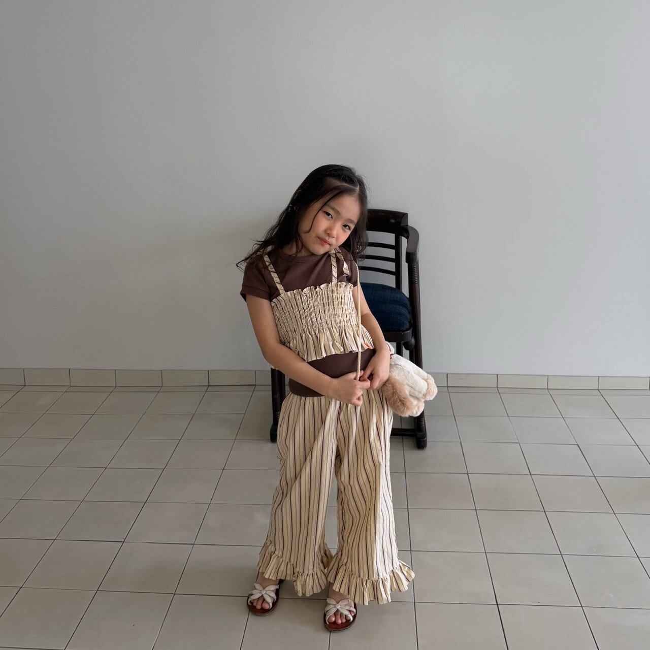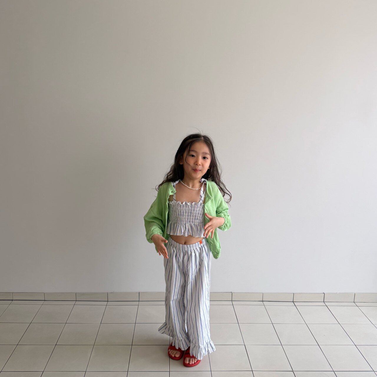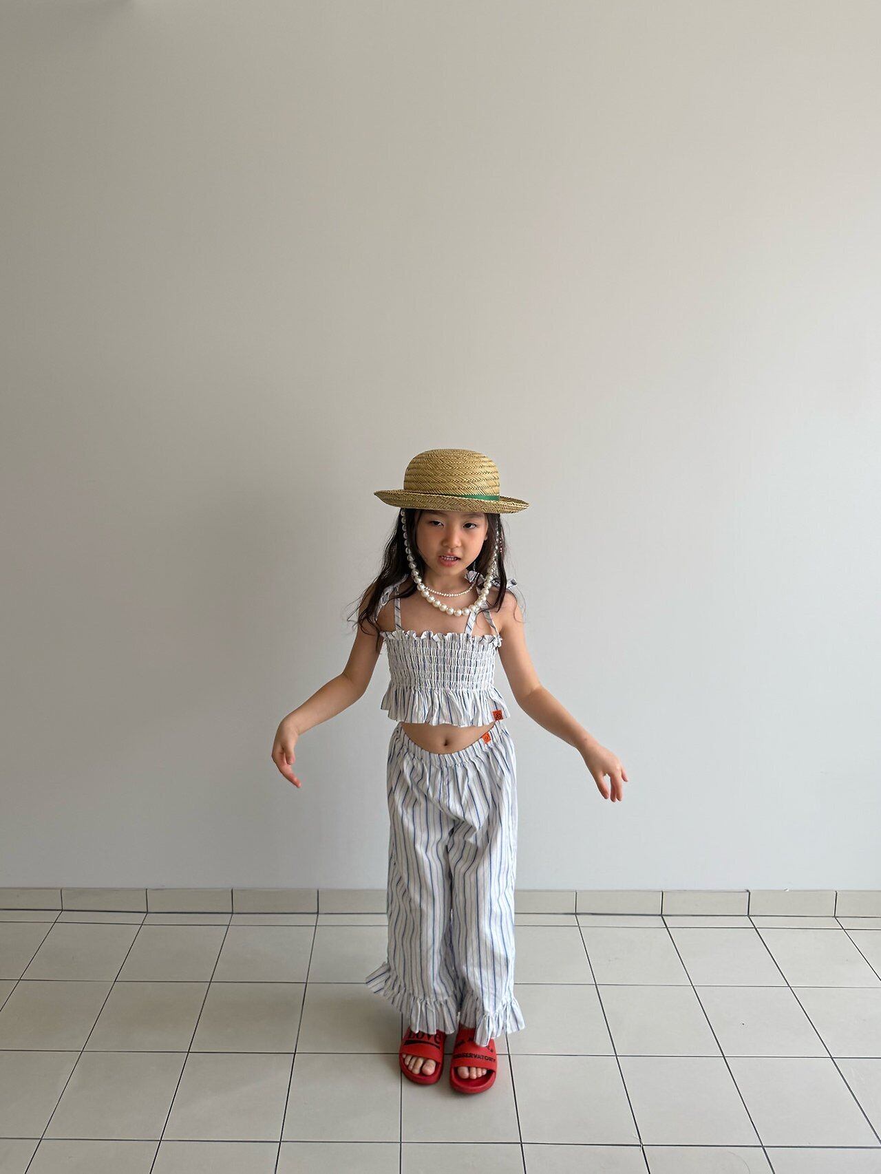昨年のコンスモックトップがとても人気だったため、今年はよりキッチュで可愛らしいスタイルに、クロップ丈で仕上げてみました。旅行先では1枚で着てもとても可愛いですが、普段はTシャツの上にレイヤードしても使いやすく、着回し力の高いアイテムとしておすすめです。ミシャフリルパンツとのセットアップもとても可愛いです。